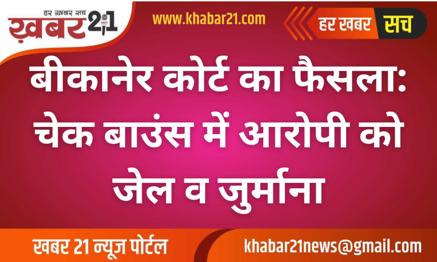 बीकानेर। चेक बाउंस के एक मामले में अदालत ने सख्त रुख अपनाते हुए आरोपी को दोषी करार दिया है। Bikaner की अदालत ने संजय कंसारा उर्फ संजय ठठेरा को छह माह के कारावास और 1.50 लाख रुपये के जुर्माने की सजा सुनाई है।