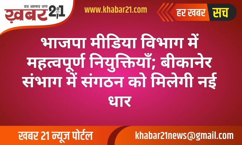 बीकानेर। भारतीय जनता पार्टी (भाजपा) के प्रदेश नेतृत्व के निर्देशानुसार, संगठन को जमीनी स्तर पर और अधिक प्रभावी, सक्रिय तथा संचार की दृष्टि से सुदृढ़ बनाने के उद्देश्य से बीकानेर संभाग के मीडिया विभाग में महत्वपूर्ण नियुक्तियों की घोषणा की गई है। इन नियुक्तियों का मुख्य ध्येय आगामी सांगठनिक कार्यक्रमों, केंद्र व राज्य सरकार की जनहितकारी नीतियों और पार्टी की विचारधारा को जन-जन तक पूरी प्रखरता के साथ पहुँचाना है।
