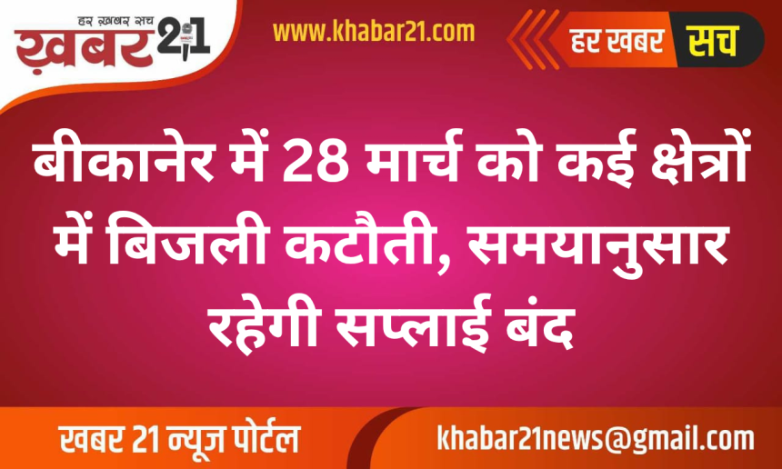 बीकानेर में विद्युत तंत्र के रख-रखाव के चलते 28 मार्च (शनिवार) को विभिन्न इलाकों में निर्धारित समय के अनुसार बिजली आपूर्ति बाधित रहेगी।