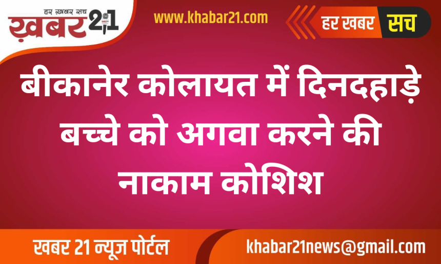 बीकानेर के श्रीकोलायत थाना क्षेत्र में शनिवार दोपहर करीब 2 बजे एक 8 वर्षीय बच्चे के अपहरण की कोशिश हुई, जिसे समय रहते मां के हस्तक्षेप से रोका गया। पीड़ित शिव माली के अनुसार उनका बेटा दक्ष माली घर के आंगन में खेल रहा था, तभी मोटरसाइकिल पर सवार एक अज्ञात युवक ने उसे बाहर बुलाया। जैसे ही बच्चा पास पहुंचा, आरोपी ने उसका मुंह बंद कर पकड़ लिया।