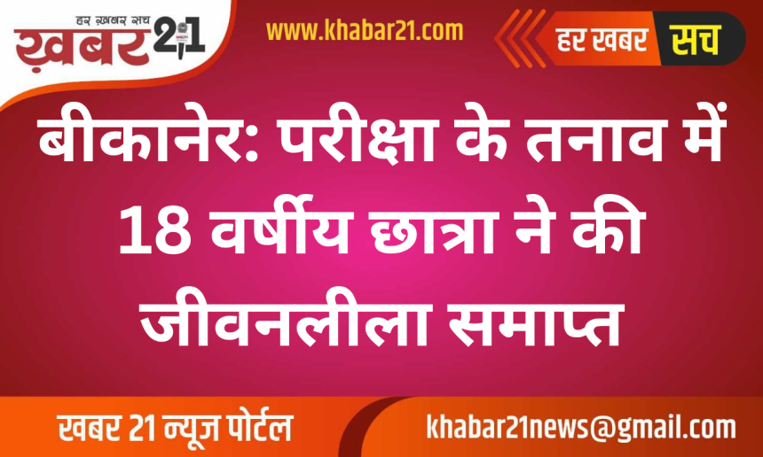 बीकानेर: शहर के जेएनवीसी थाना क्षेत्र के पटेल नगर से एक हृदयविदारक घटना सामने आई है, जहाँ प्रतियोगी परीक्षा की तैयारी कर रही एक 18 वर्षीय युवती ने आत्महत्या कर ली। घटना 8 अप्रैल की दोपहर करीब 12:30 बजे की बताई जा रही है।
