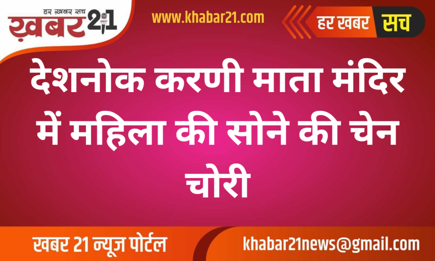 बीकानेर के देशनोक स्थित करणी माता मंदिर में दर्शन करने पहुंचे एक दंपति के साथ चोरी की घटना सामने आई है। इस संबंध में देशनोक पुलिस थाने में गुजारो का मोहल्ला निवासी सुरज कुमार ने अज्ञात आरोपी के खिलाफ मामला दर्ज करवाया है।