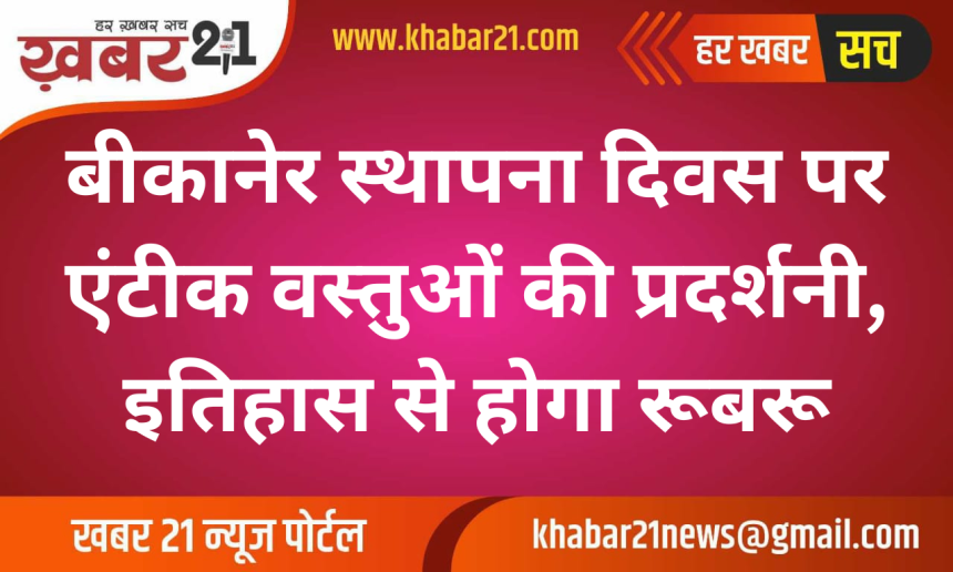 बीकानेर नगर के 539वें स्थापना दिवस के अवसर पर शहर में ऐतिहासिक धरोहरों को प्रदर्शित करने के लिए विशेष एंटीक वस्तुओं की प्रदर्शनी आयोजित की जाएगी। यह आयोजन 15 से 17 अप्रैल तक महारानी सुदर्शना कुमारी कला दीर्घा में होगा, जिसका उद्घाटन 15 अप्रैल को सुबह 11 बजे किया जाएगा। प्रदर्शनी प्रतिदिन सुबह 10 बजे से शाम 8 बजे तक आमजन के लिए खुली रहेगी।