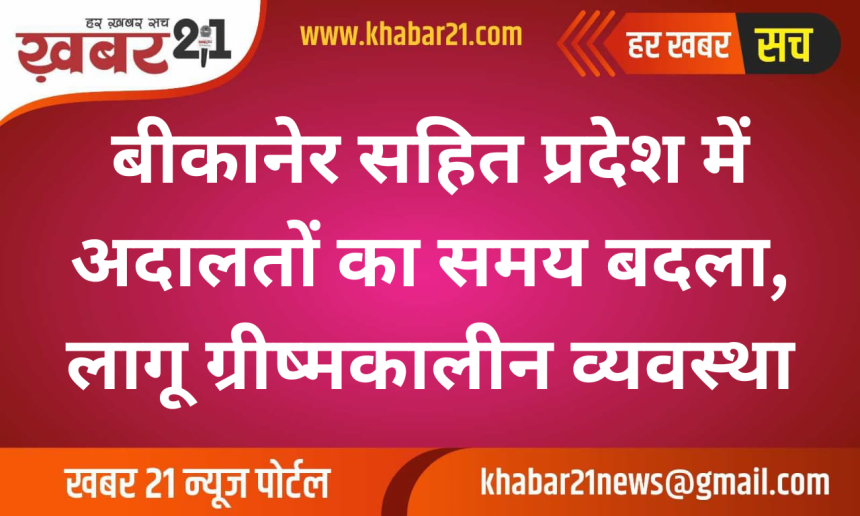 गर्मी के बढ़ते असर को देखते हुए बीकानेर सहित पूरे प्रदेश में न्यायालयों के समय में बदलाव किया गया है। सोमवार से नई ग्रीष्मकालीन समय सारिणी लागू हो गई है, जो 28 जून तक प्रभावी रहेगी।