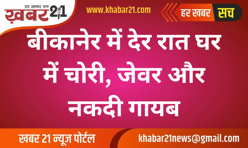 बीकानेर के मुक्ता प्रसाद थाना क्षेत्र में चोरी की एक घटना सामने आई है। अज्ञात चोरों ने 25 अप्रैल की रात करीब 11 बजे एक घर को निशाना बनाया और ताले तोड़कर अंदर घुस गए। चोर घर से सोने-चांदी के आभूषण और नकदी लेकर फरार हो गए।